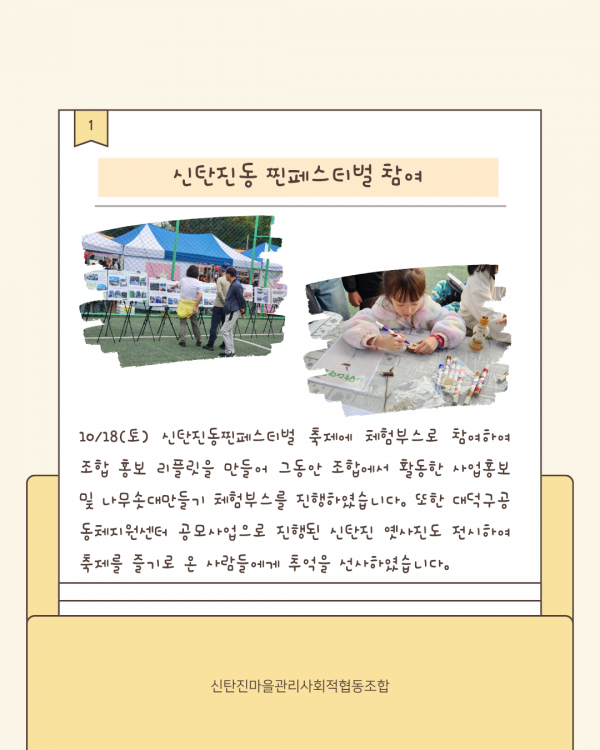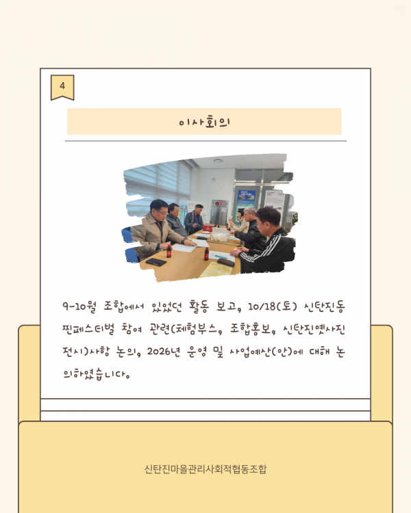 10월 조합활동소식 페이지 정보 작성자 최고관리자 댓글댓글 0건 조회조회 82회 작성일작성일 25-11-10 10:19 본문 10월 조합에서 있었던 활동 공유합니다. 목록 답변 이전글11월 조합활동소식 25.12.05 다음글9월 조합활동소식 25.10.13