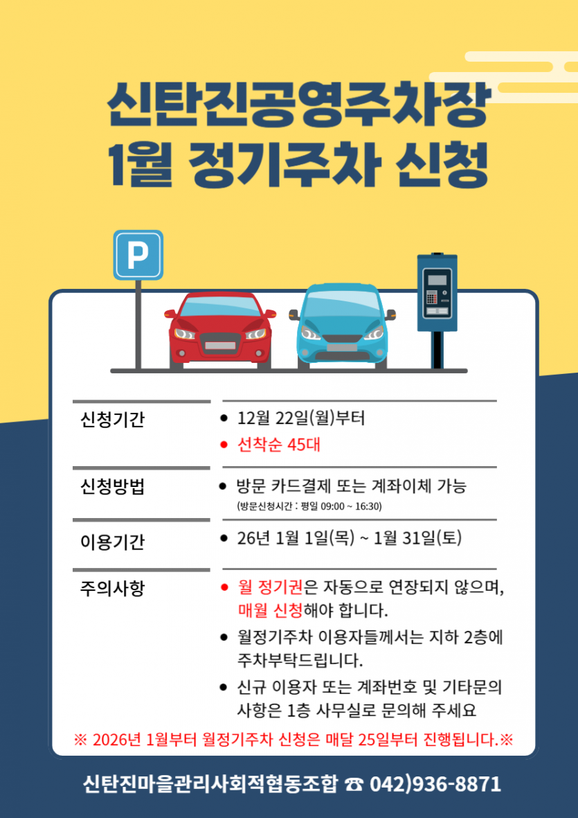 - 신탄진 공영주차장 2026년 1월 정기주차권 신청안내 -